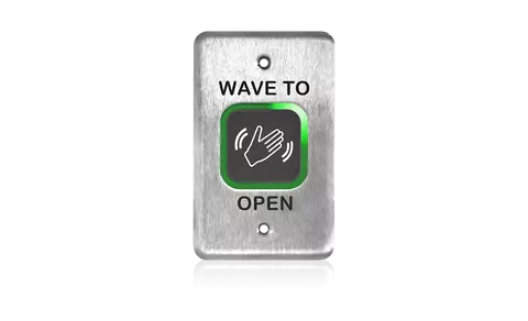 Stainless steel, single gang – “WAVE TO OPEN” text + hand logo