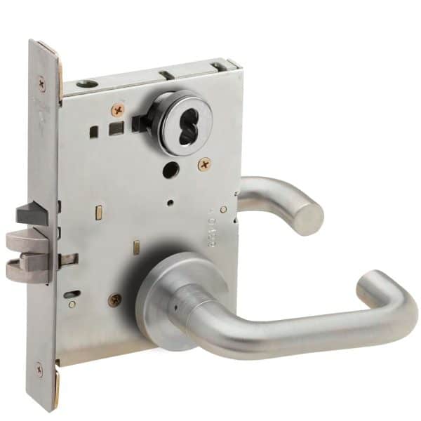 Grade 1 Storeroom Mortise Lock, Schlage FSIC Less Core, 03 Lever, A Rose, Satin Chrome Finish, Field Reversible