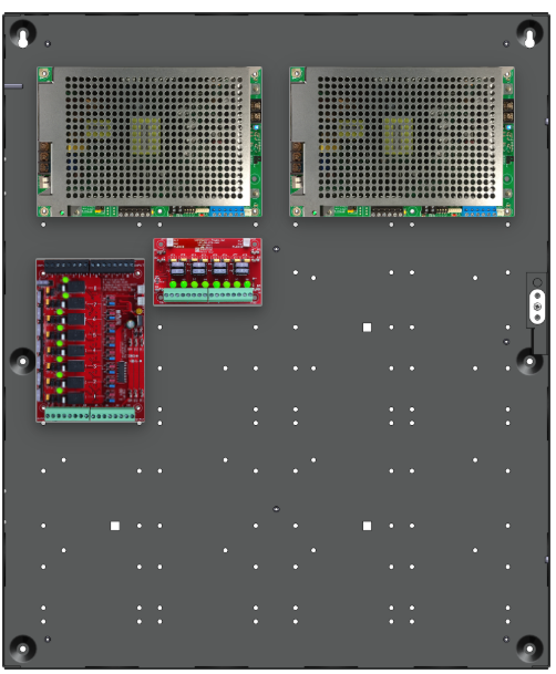 • 1 x C8 (8 Relay Lock Outputs) 3A fused outputs, programmable for failsafe/failsecure, FAI, NC/NO input, voltage or dry output per zone.  Dual buss voltage selection by zone, OutSmart dual color LEDs