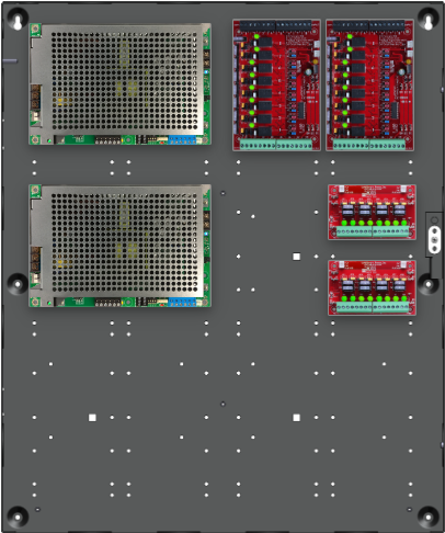 • 2 x C8 (16 Relay Lock Outputs) 3A fused outputs, programmable for failsafe/failsecure, FAI, NC/NO input, voltage or dry output per zone.  Dual buss voltage selection by zone, OutSmart dual color LEDs