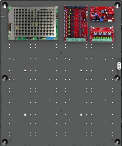 • 1 x C8 (8 Relay Lock Outputs) 3A fused outputs, programmable for failsafe/failsecure, FAI, NC/NO input, voltage or dry output per zone.  Dual buss voltage selection by zone, OutSmart dual color LEDs