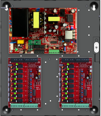 • 2 x C8 (16 Relay Lock Outputs) 3A fused outputs, programmable for failsafe/failsecure, FAI, NC/NO input, voltage or dry output per zone.  Dual buss voltage selection by zone, OutSmart dual color LEDs