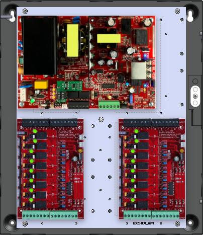 • 2 x C8 (16 Relay Lock Outputs) 3A fused outputs, programmable for failsafe/failsecure, FAI, NC/NO input, voltage or dry output per zone.  Dual buss voltage selection by zone, OutSmart dual color LEDs