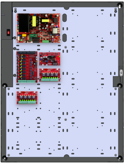 • 1 x C8 (8 Relay Lock Outputs) 3A fused outputs, programmable for failsafe/failsecure, FAI, NC/NO input, voltage or dry output per zone.  Dual buss voltage selection by zone, OutSmart dual color LEDs