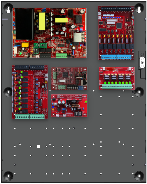 • 1 x C8 (8 Relay Lock Outputs) 3A fused outputs, programmable for failsafe/failsecure, FAI, NC/NO input, voltage or dry output per zone.  Dual buss voltage selection by zone, OutSmart dual color LEDs