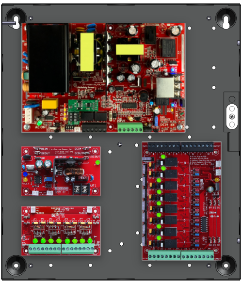 • 1 x C8 (8 Relay Lock Outputs) 3A fused outputs, programmable for failsafe/failsecure, FAI, NC/NO input, voltage or dry output per zone.  Dual buss voltage selection by zone, OutSmart dual color LEDs