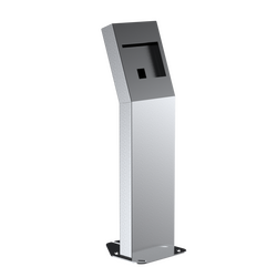 53″ tall stainless steel kiosk tower for DoorBird D31TDH. Polished with a brushed #4 finish with mirror polished corners. Made from heavy duty .120″ thick stainless sheet and designed with a .25″ thick internal base plate and a large removable access panel on the backside. Includes .25″ thick external baseplate which allows the kiosk to stand on it’s own without the need for anchoring to the floor. Run your wire above or below ground with built in channeling and wiring access on the back of the kiosk to accept power ingress.